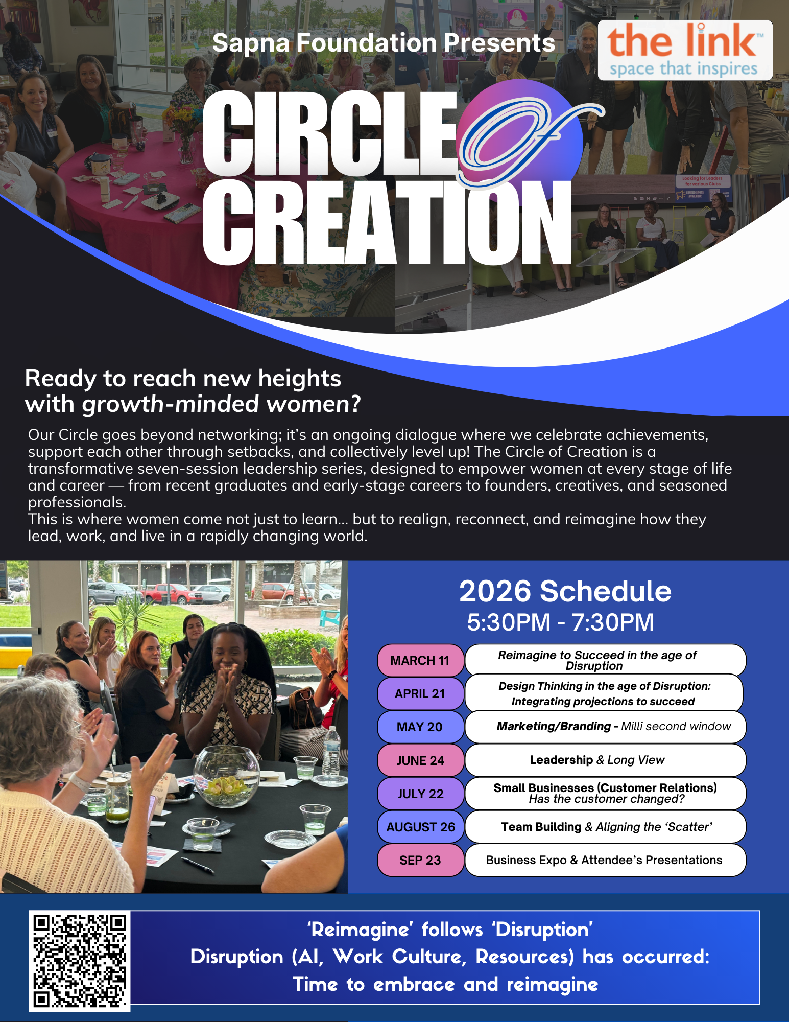 Women’s Program: Circle of Creation – Reimagine Follows Disruption is an event focused on supporting women entrepreneurs as they navigate change, realignment, and growth in evolving business environments. This session launches the Circle of Creation series and centers on the theme of reimagining business through disruption. The program features Debbie Kantor, founder of Hero Medical Technologies, who will share her journey from prototype development to securing multi-million-dollar funding from the Department of Defense. Her story highlights strategic pivoting, mission-driven entrepreneurship, building diverse teams, navigating technological change, and sustaining a business through disruption. The evening includes a speaking engagement followed by an interactive exercise, offering participants an opportunity to reflect on their own business direction while engaging in hands-on discussion around execution, resilience, and long-term vision.